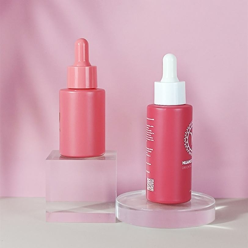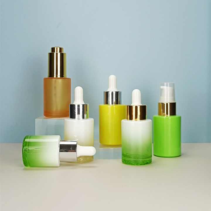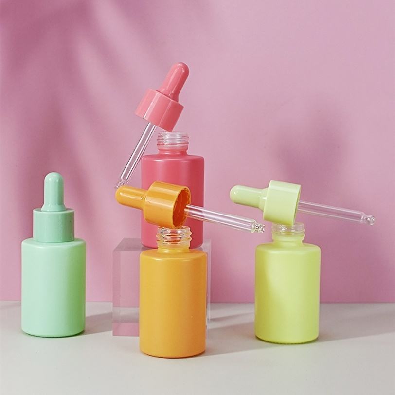 Flacon compte-gouttes en verre pour sérum de soin, forme cylindrique à épaule plate, coloris vert, jaune, blanc, rose, bleu, violet, or rose, 20ml, 30ml