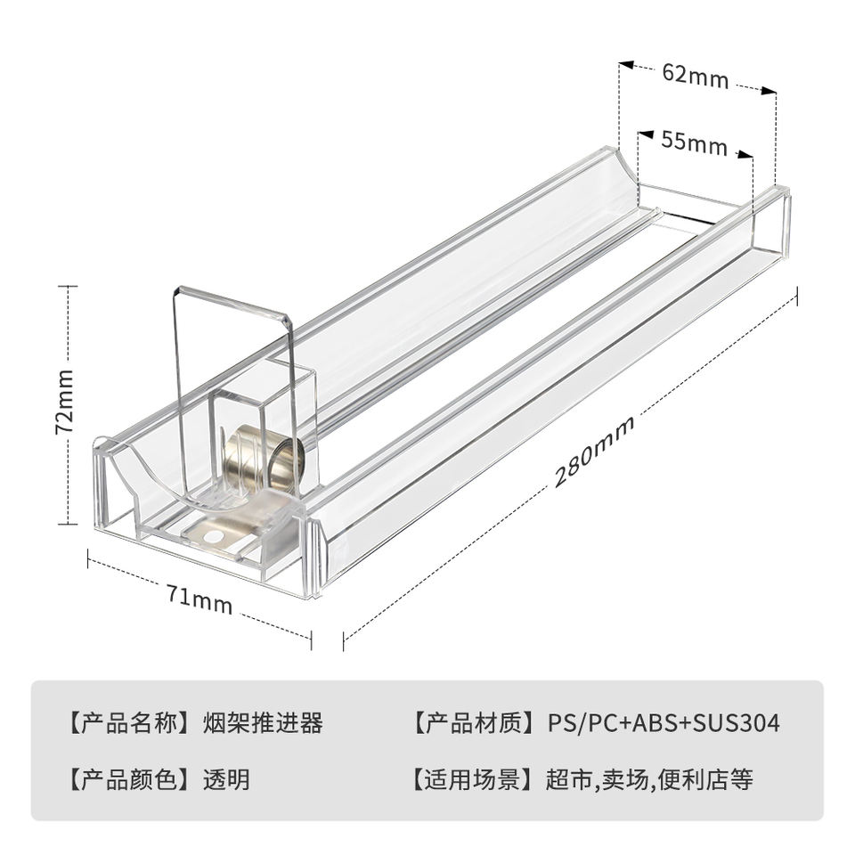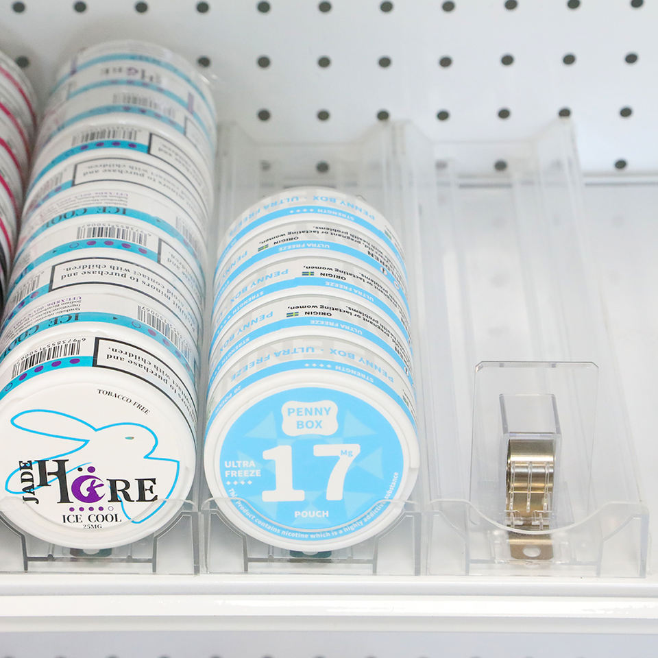 Système de poussoir d'étagère pour sachets de nicotine en boîtes aromatisées, à poussoir automatique pour une classification et une publicité fluides sur les étagères de supermarché