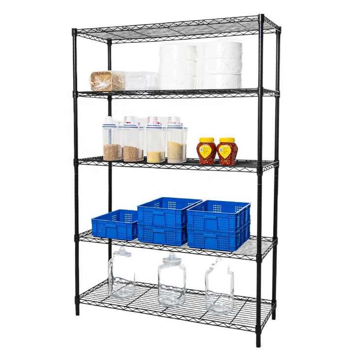 Conception flexible et réglable, étagère en fil métallique à 5 niveaux, revêtement en poudre noire, étagère en fil d'acier pour une utilisation polyvalente, rangement