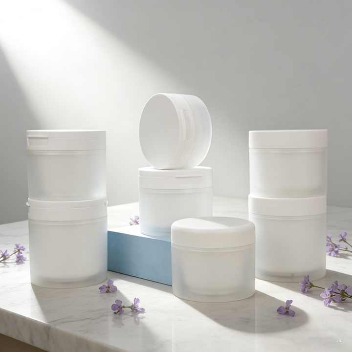 Pot en plastique givré avec couvercle à clapet pour produits démaquillants