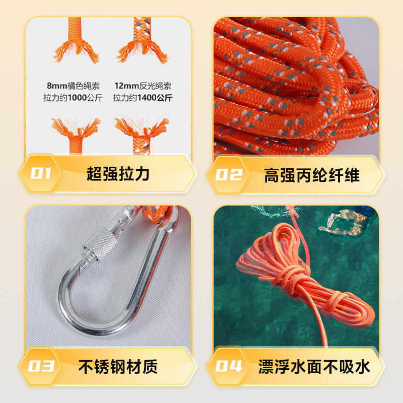 Corde de sauvetage flottante orange rouge 10 20 30 mètres longueurs personnalisées avec anneau et mousqueton pour utilisation d'urgence en cas de sécurité aquatique