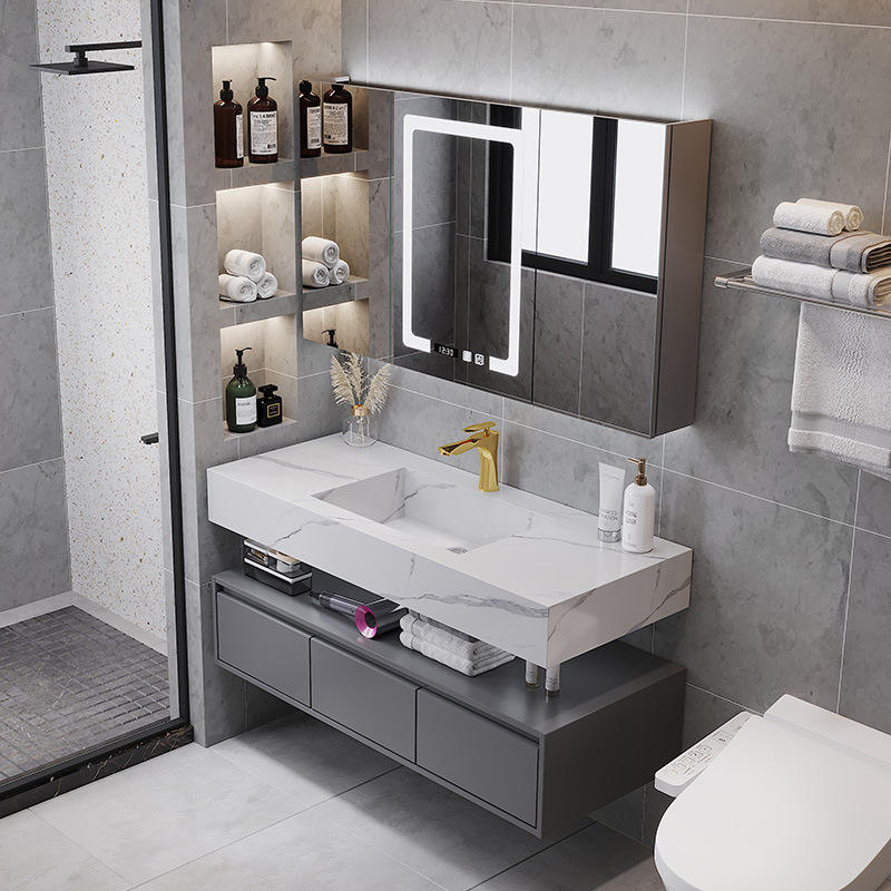 Meuble-lavabo flottant avec vasque en pierre frittée sans joint, armoire de salle de bain en bois d'hévéa, style minimaliste