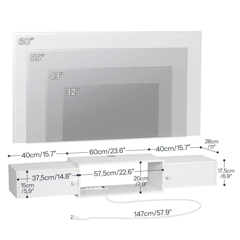 Meuble TV flottant avec prise de courant, meuble mural moderne pour console multimédia, étagère pour rangement sous la télévision, centre de divertissement
