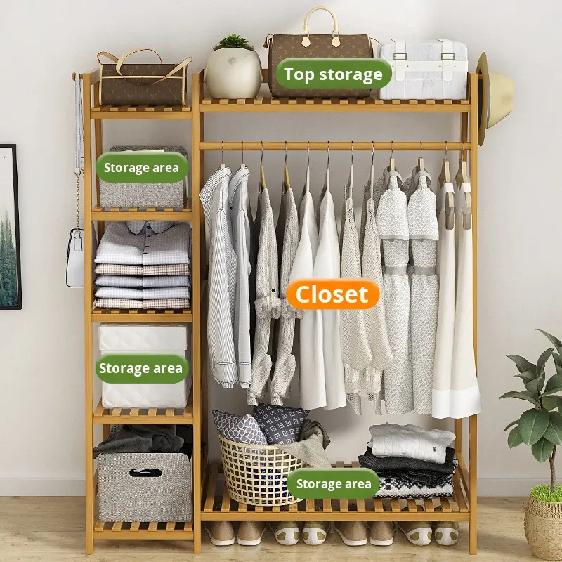 Porte-vêtements en bambou moderne multifonctionnel sur pied, simple, épaissi, pour chambre à coucher, porte-manteau, séchage, rangement
