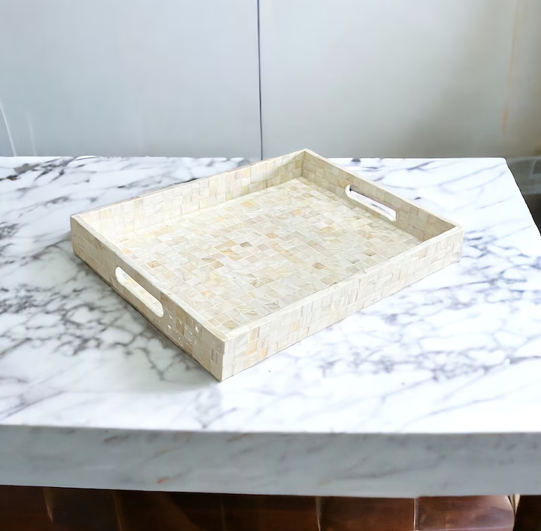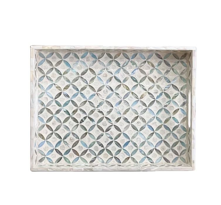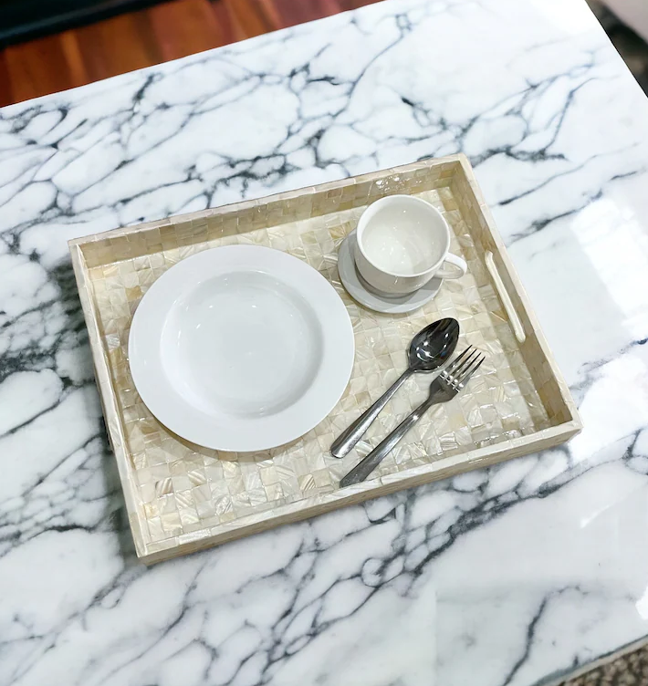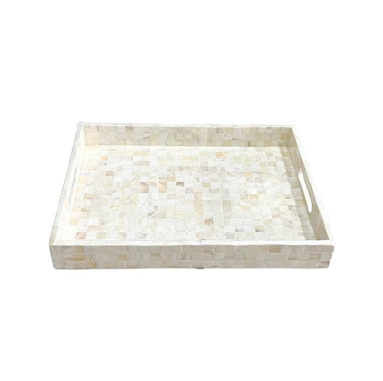 Plateau de service en bois rectangulaire fait à la main Flora Plats décoratifs de luxe occidentaux minimalistes Assiettes Incrustation d'os écologique Mère
