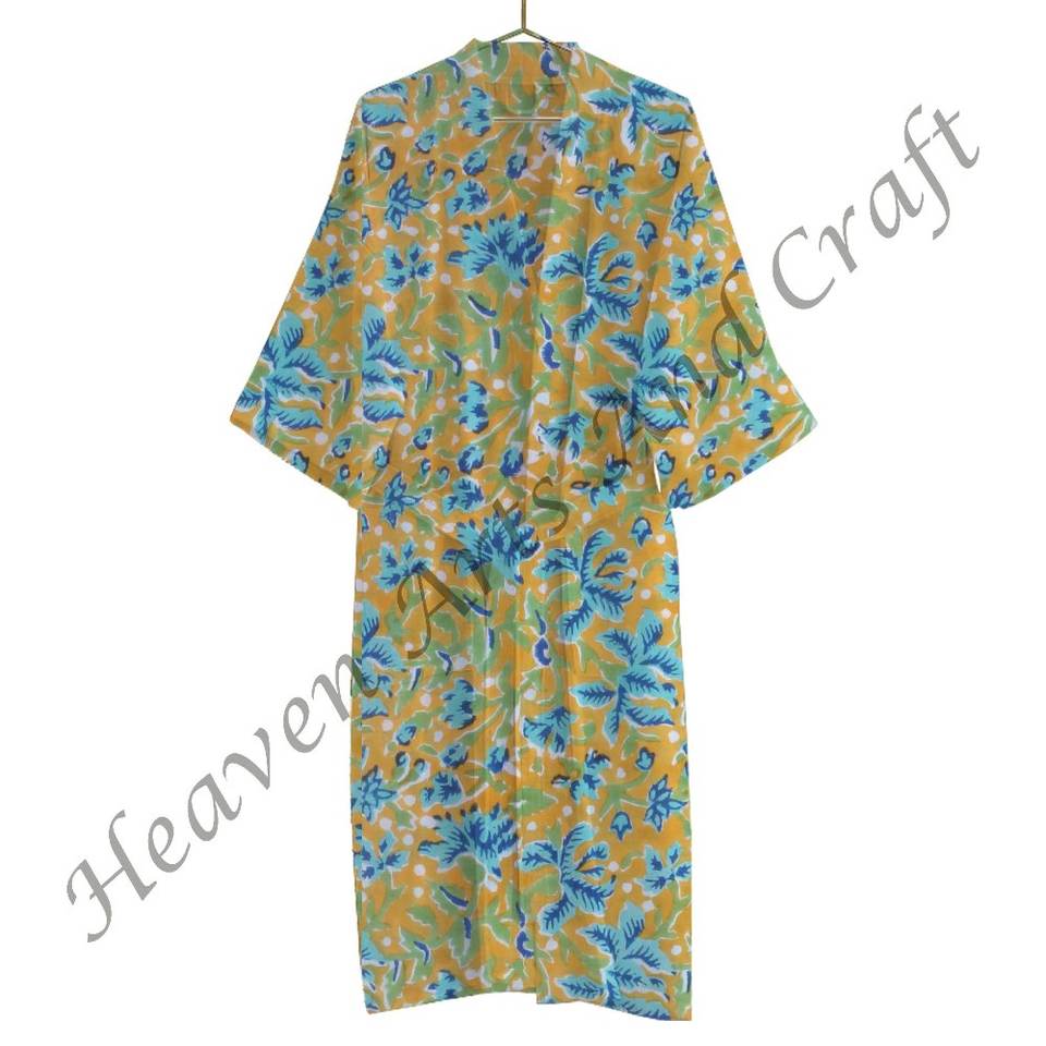 Kimono en pur coton imprimé de blocs floraux Couverture de plage et de festival pour femmes Robe faite à la main Vêtements d'été Bikini Peignoir en coton