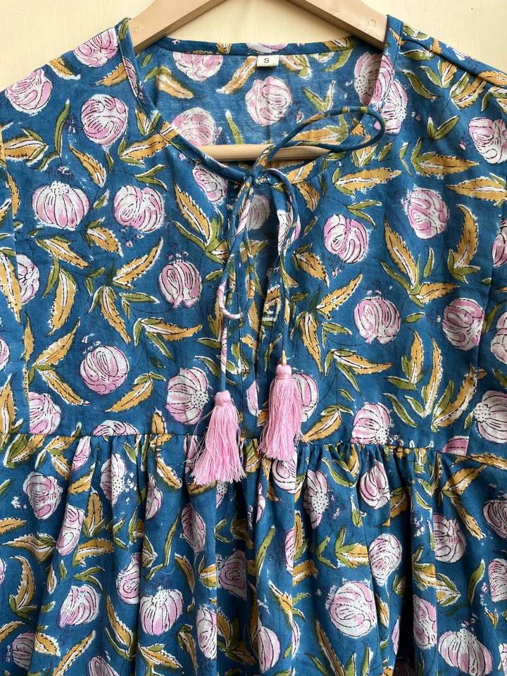 Tunique à imprimé floral en bloc, col rond avec fermeture à cordon, imprimé à la main, manches longues, haut décontracté pour femmes, cadeau pour elle