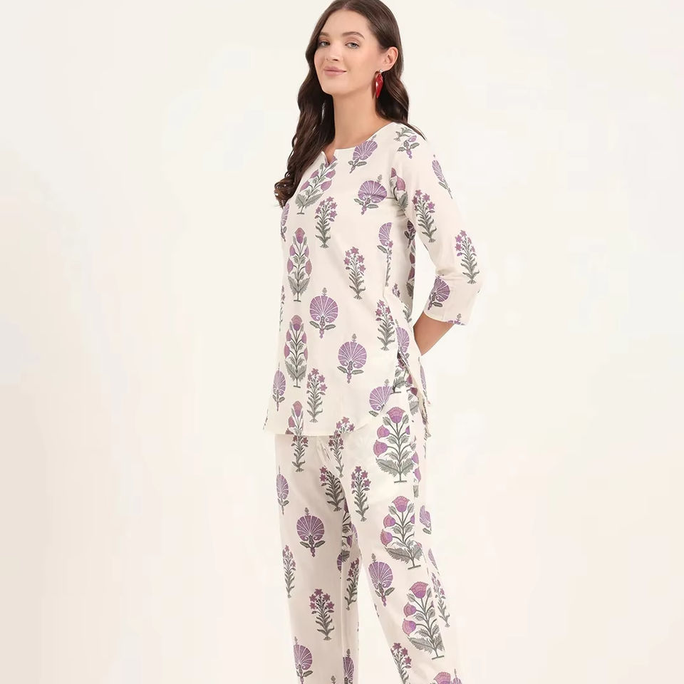 Floral Cotton 2-Piece Summer Casual Set Three-Quarter Sleeve Ankle-Length Vintage Pattern Women's Kurta Shorts