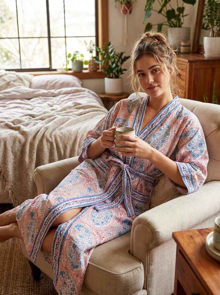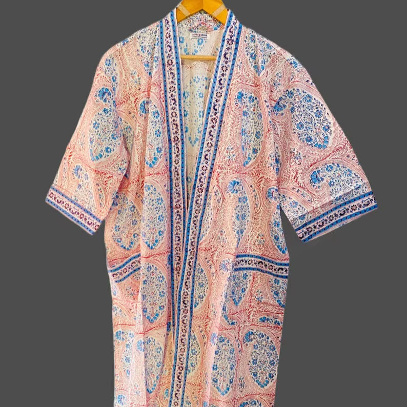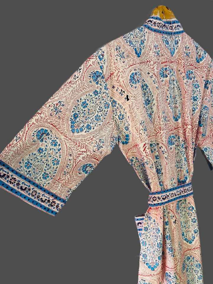 Robe Kimono en Coton à Motifs Floraux Imprimé Paisley avec Ceinture à Rayures – Idéale pour Hôtels, Spas, Boutiques – Commande en Gros – Grandes Tailles Disponibles