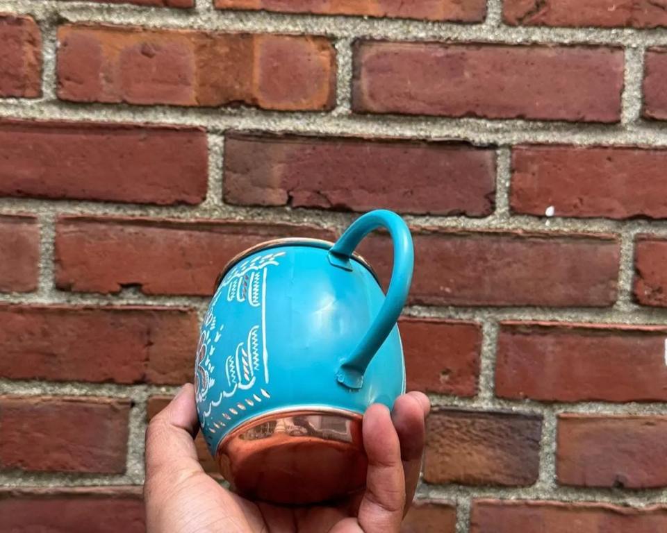 Tasse en cuivre bleu gravée motif floral, idéale pour le thé et l'eau détox, vaisselle traditionnelle et pour le bien-être à la maison