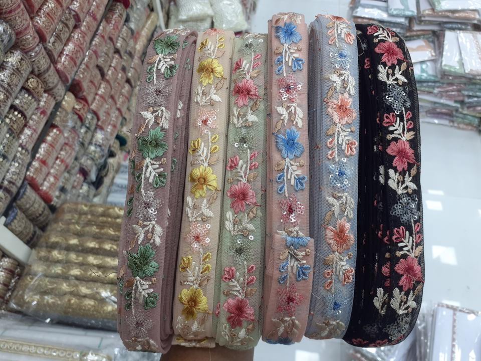 Dentelles brodées florales avec fleurs multicolores, idéales pour les bordures et les bordures et pour les projets d'art et d'artisanat