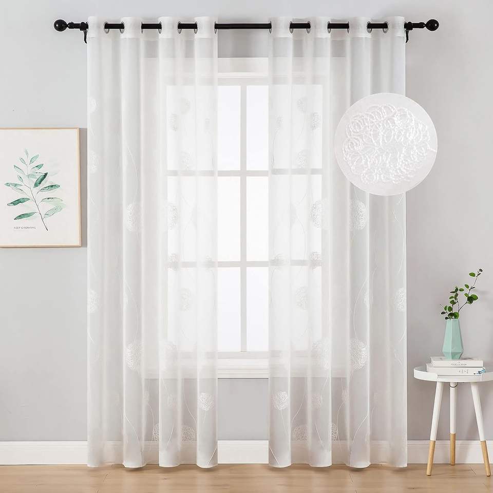 Rideaux Voilages Tulle Blanc Doux à Broderie Florale, Rideaux à Œillets Modernes Transparents Brodés pour Salon Chambre