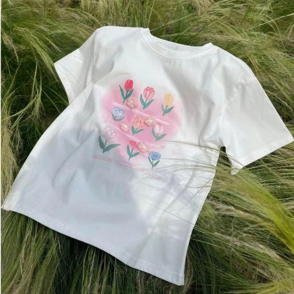 T-shirt à broderie graphique florale Conception d'impression de logo personnalisé Choisissez la couleur du texte et le placement T-shirt d'été en coton doux