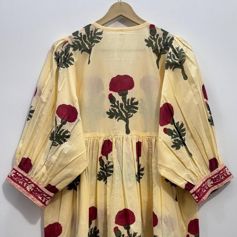 Robe mini en coton écologique à imprimé floral fait main, lavable, col en V, manches 3/4, dentelle, ourlet à volants, style Kyra, naturelle