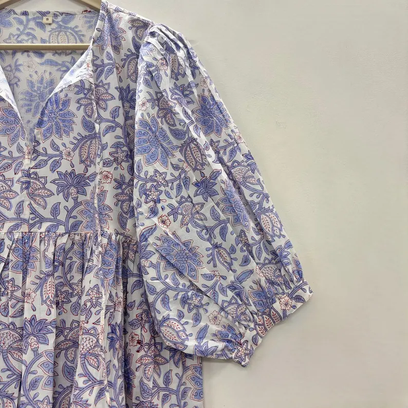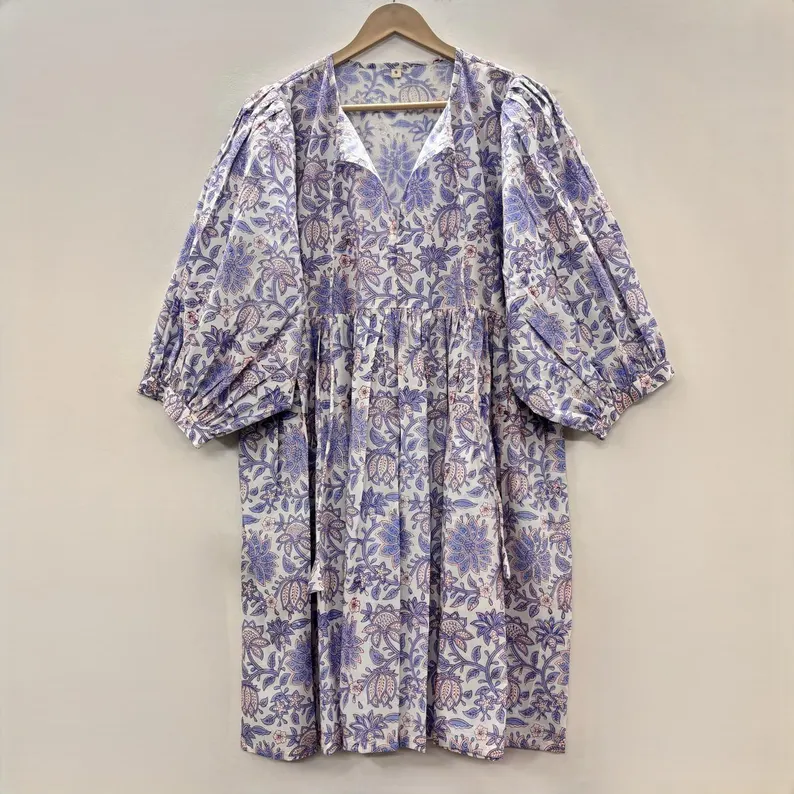 Mini-robe formelle vintage en coton 100% naturel, imprimée à la main, faite à la main, écologique, col en V, manches 3/4, ourlet à volants en dentelle, lavable