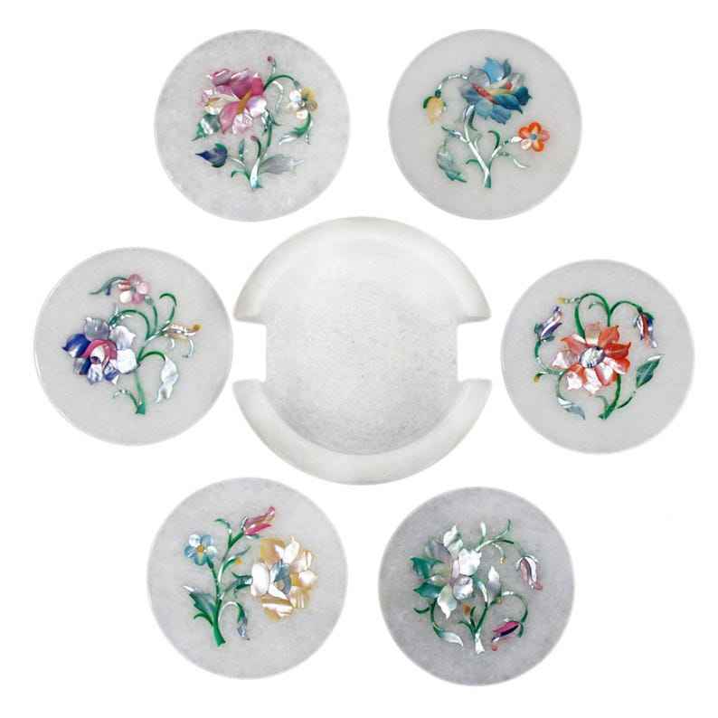Floral Mother of Pearl Marble Coasters Indian Handmade Inlay Coaster Set for Coffee Table & Home Decor