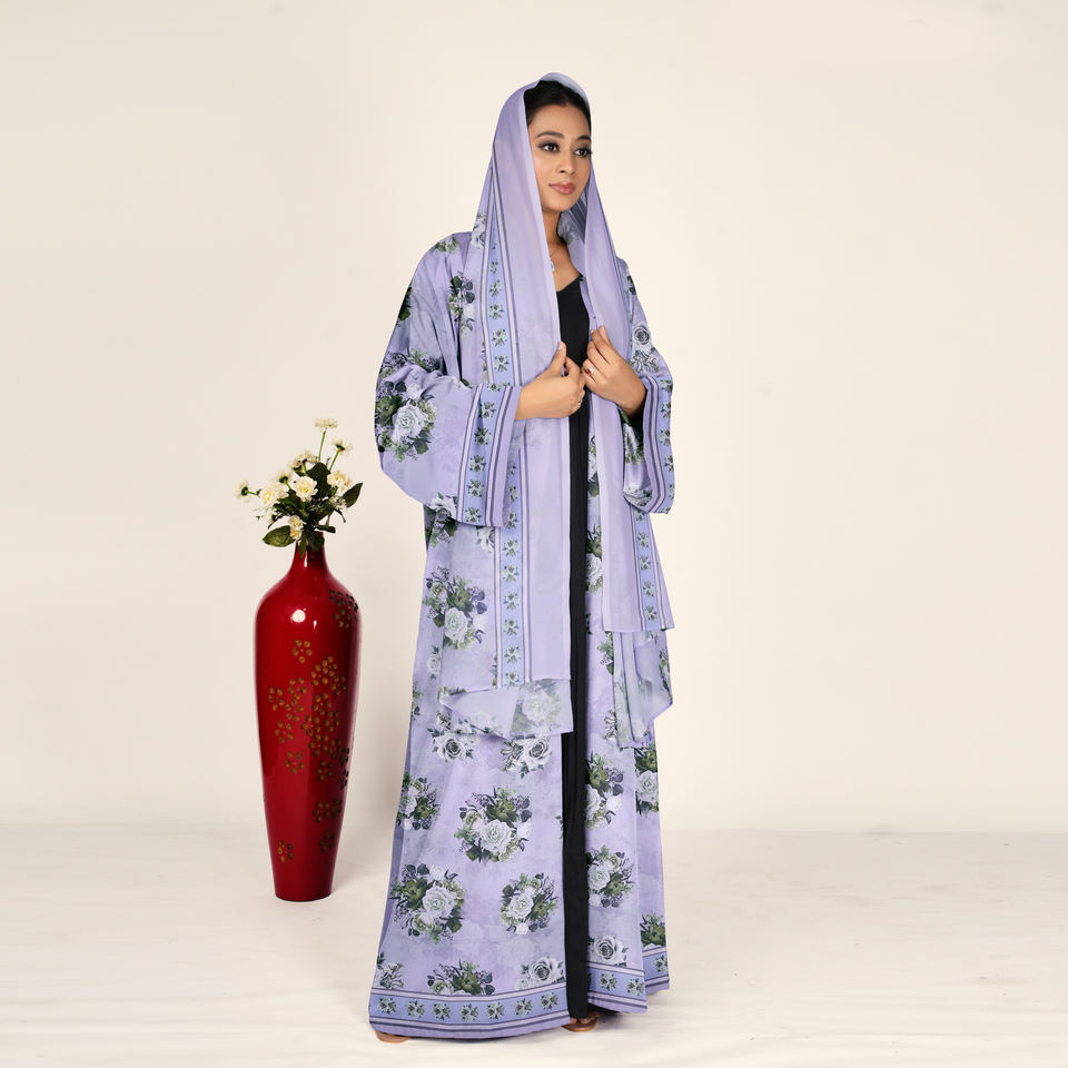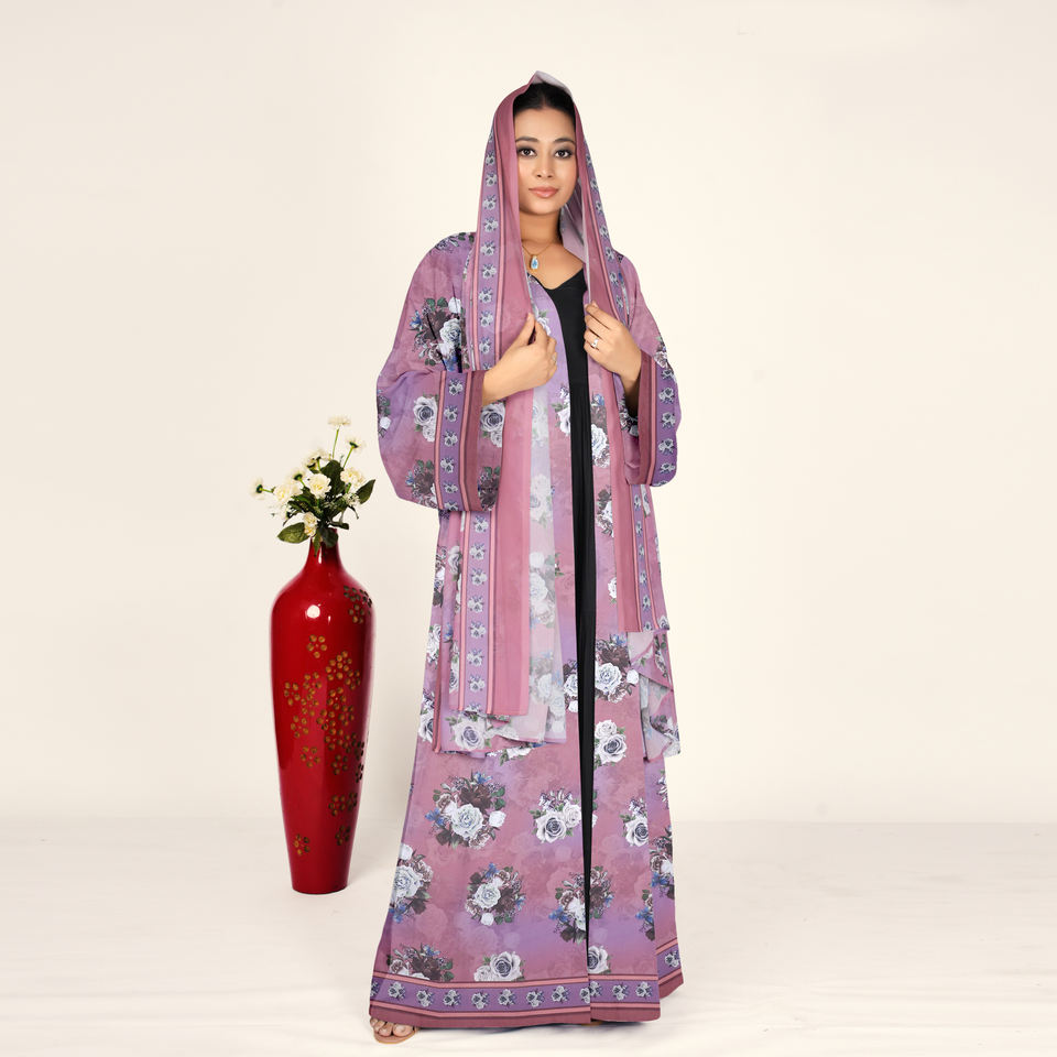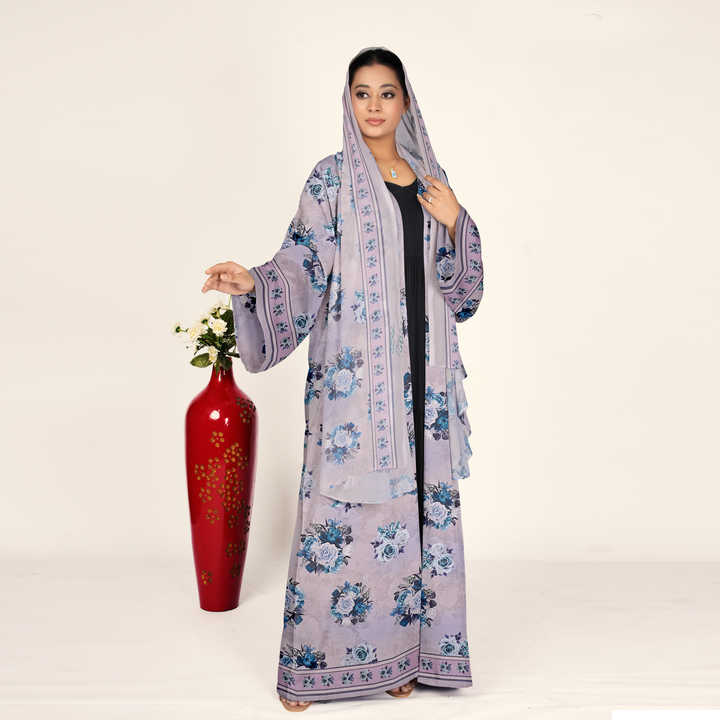 Abaya longue ample en mousseline à motif floral pour l'Aïd, avec foulard assorti, devant ouvert, manches longues fluides, robe musulmane modeste pour femme