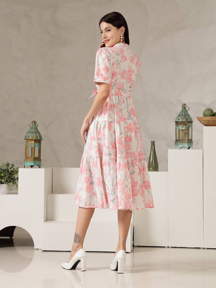 Robe mi-longue ajustée et évasée à imprimé floral Col en V Manches courtes Taille froncée Tissu en coton