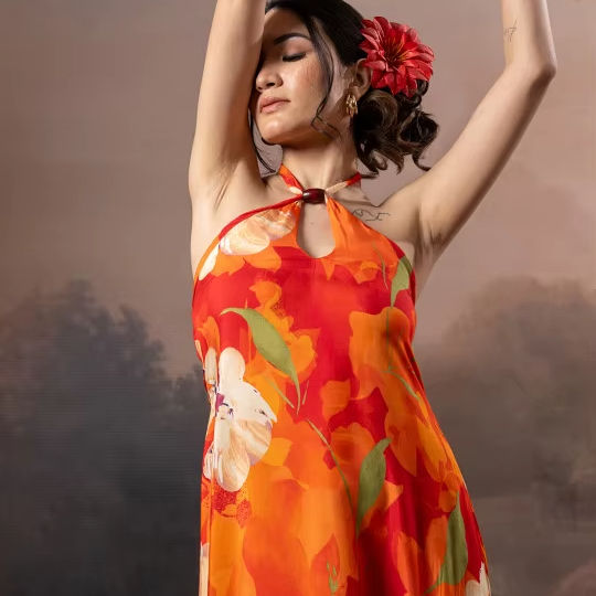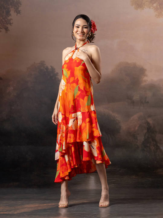 Robe midi évasée à imprimé floral, col licou, à volants, décolleté plongeant, sans manches, style sling, dos nu, taille naturelle, style élégant