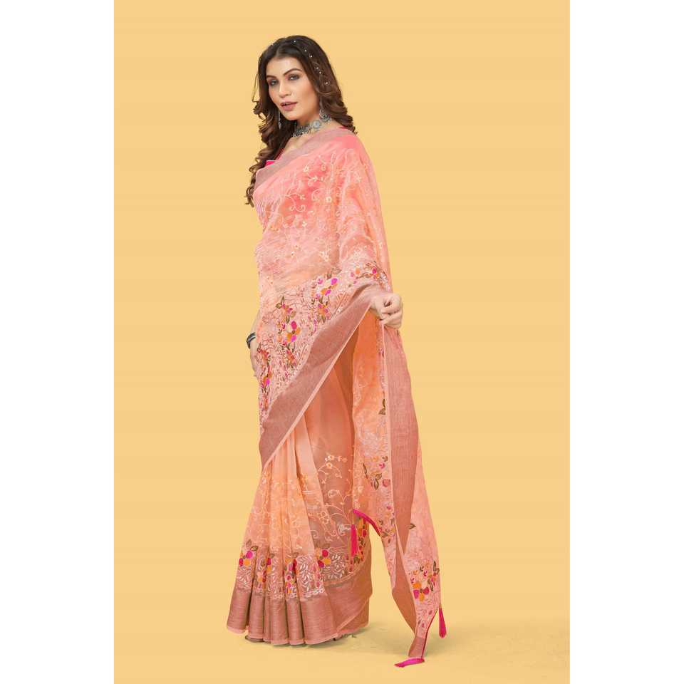 Sari à silhouette droite à imprimé floral multicolore avec travail de fils et de Zari-Dori pour les fêtes