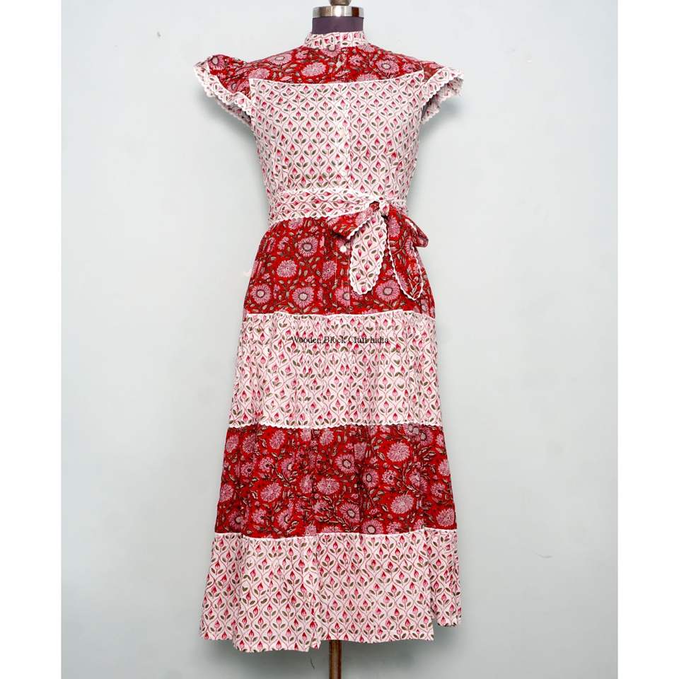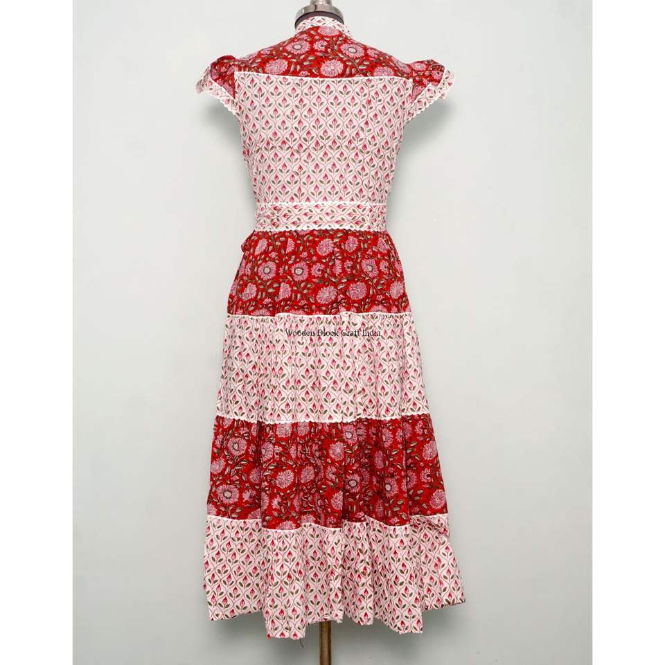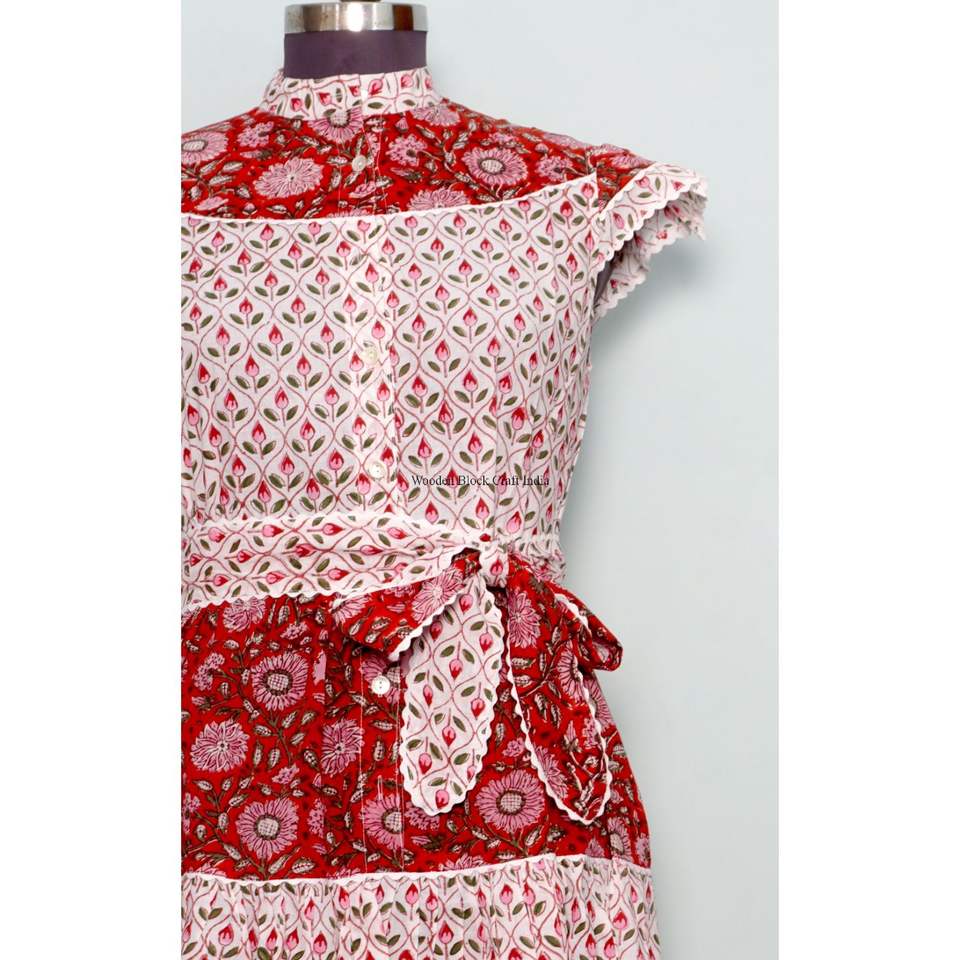 Robe Courte d'Été Imprimée Florale Coupe Trapèze Col Rond Manches Courtes en Coton Biologique Tricoté Confortable avec Boutons Style Décontracté Plage Indienne