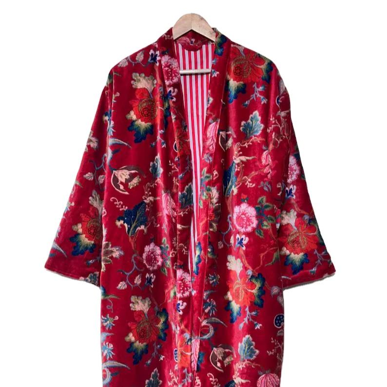 Robe kimono en velours coton rouge floral, peignoir de mariée, robe de demoiselle d'honneur, peignoir d'hiver