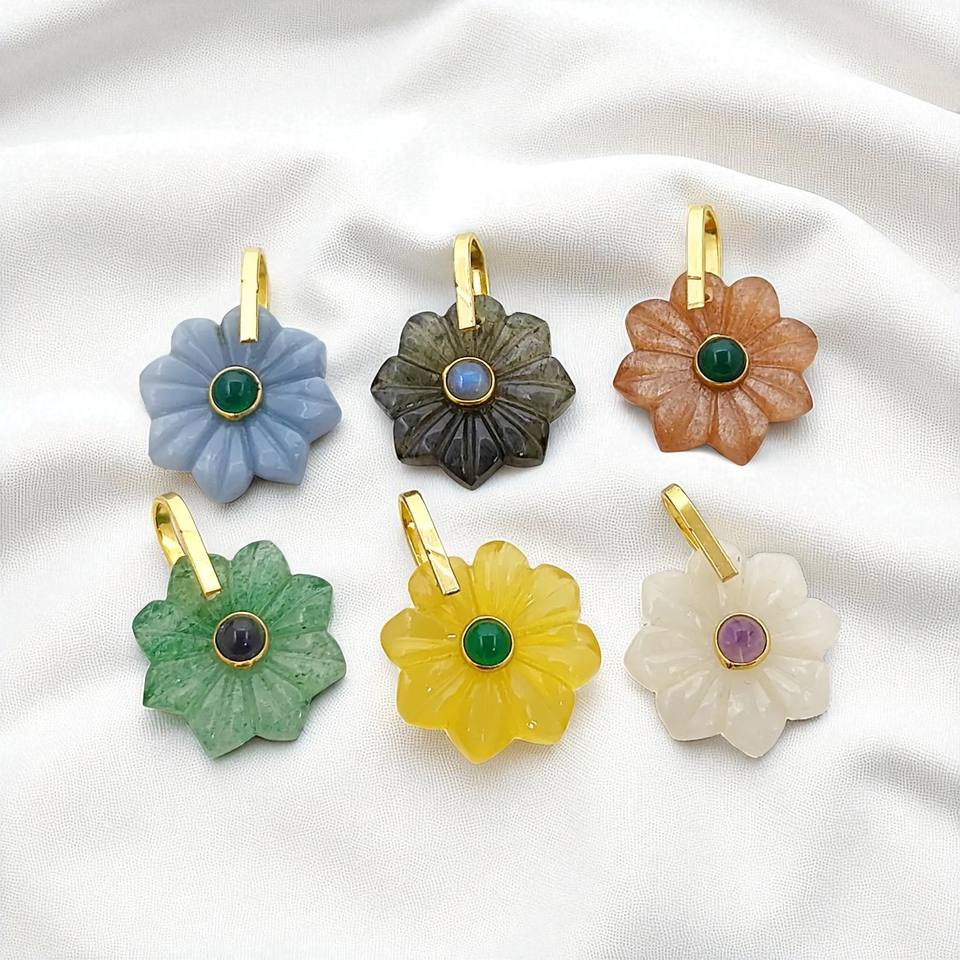 Product Name:Flower Carving Gemstone 18mm Gold Vermeil Silver Double Stone Charm