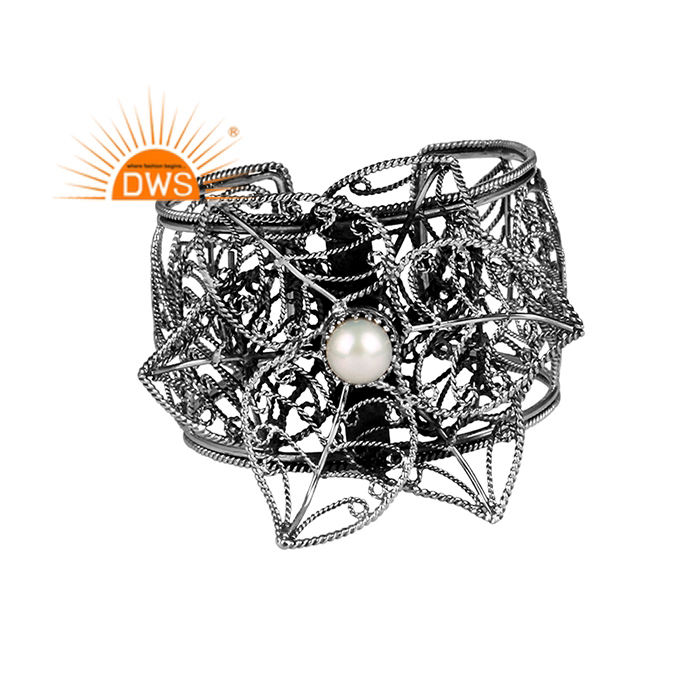 Fleur Design Solide 925 Argent Manchette Faite À La Main Bracelet Femmes Bijoux Blanc Naturel Perle Gemme Manchette Bijoux Fournisseur