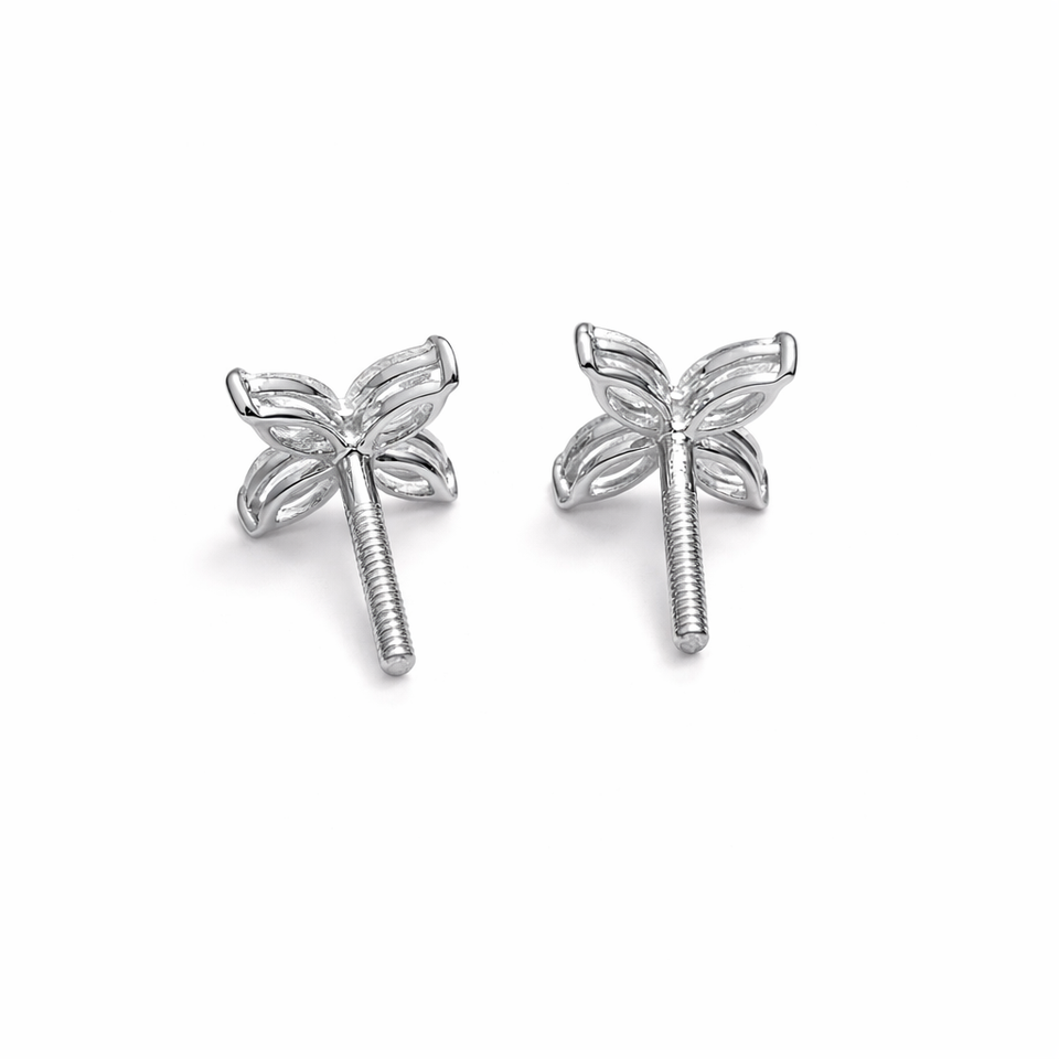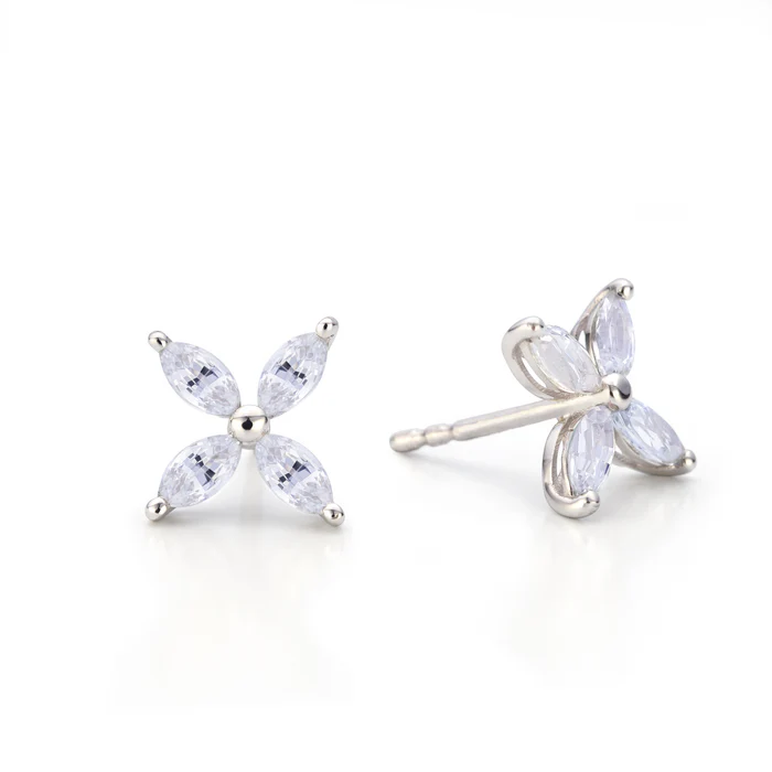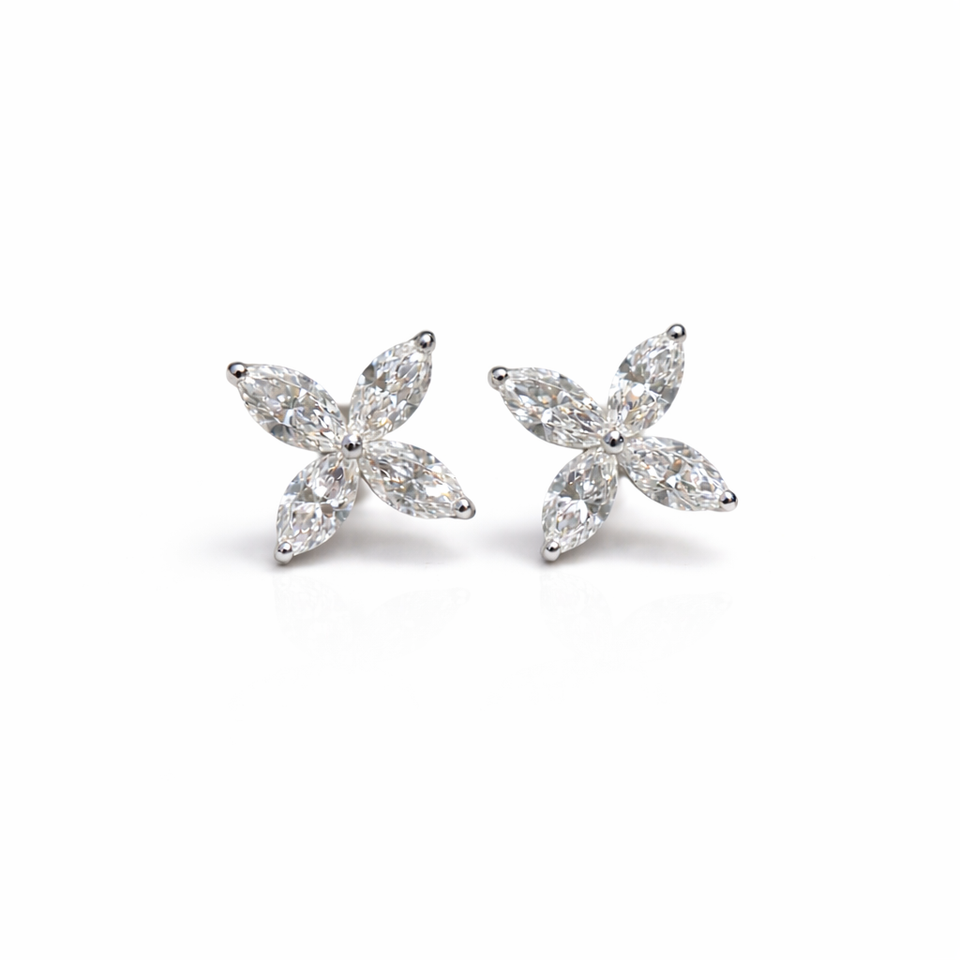 Boucles d'oreilles clous motif floral en or blanc massif 18 carats, minimalistes et célestes, avec diamants de laboratoire taille marquise, bijoux fins