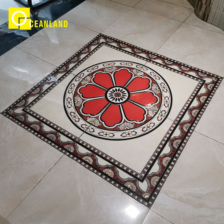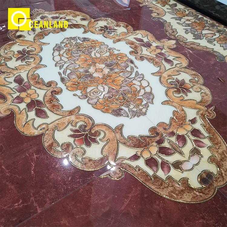 Carrelage de façade en porcelaine avec motif floral et surface dorée, type tapis.