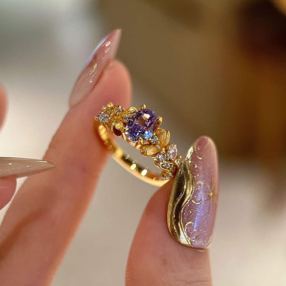 Bague Fée des Fleurs Tulipe Violette en Argent Pur S925 Plaqué Or, Luxe Haut de Gamme, Style Antique Exquis, Sertie, Hip-Hop