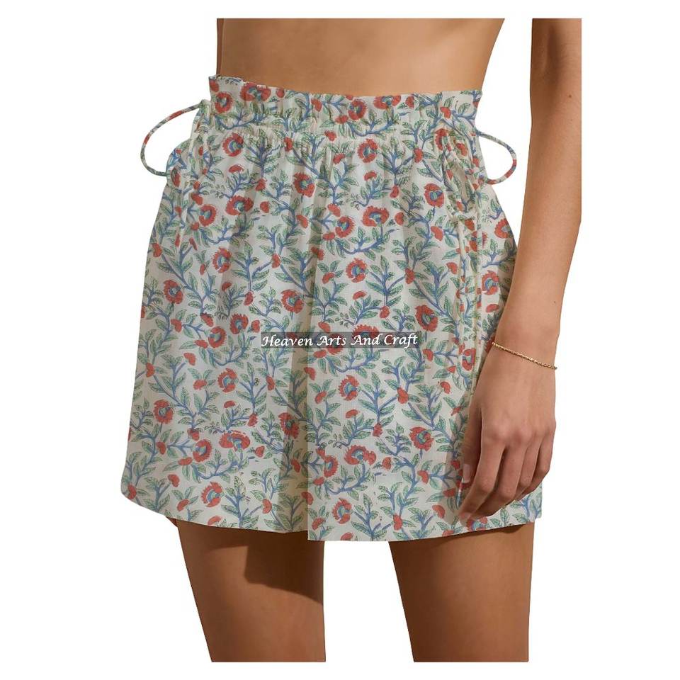Shorts de week-end à cordon de serrage imprimés fleurs, imprimés à la main en pur coton, faits à la main, en pur coton, pour cadeau