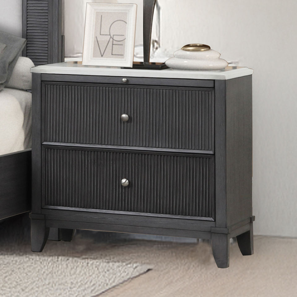 Table de chevet de chambre à coucher avec panneau cannelé et plateau en marbre, table de nuit noire moderne et minimaliste avec rangement contemporain