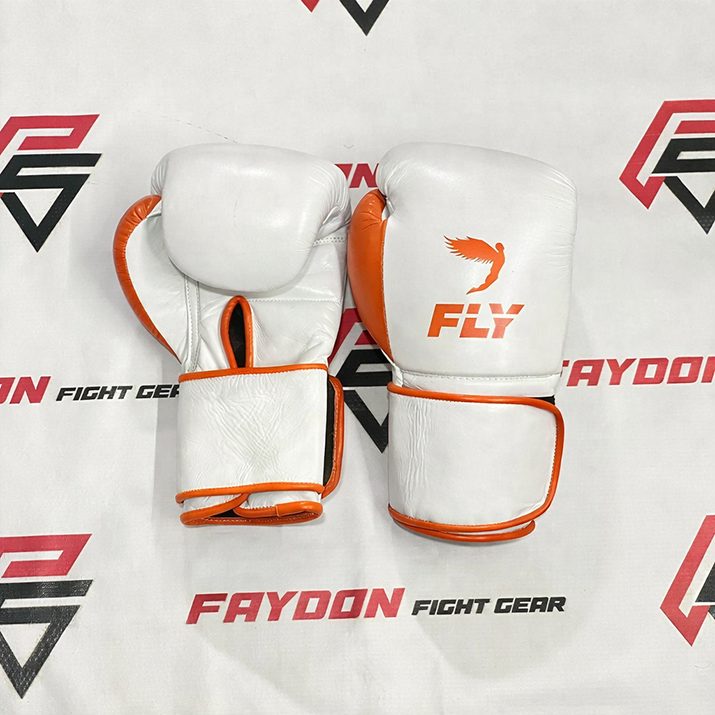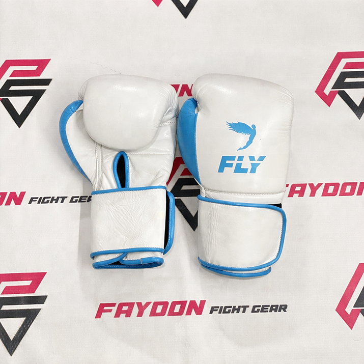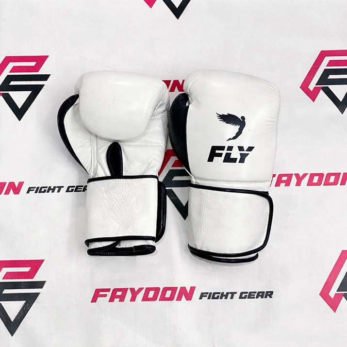 Gants de boxe Fly Muay Thai en cuir de vachette véritable faits à la main avec attaches auto-agrippantes, poignées respirantes et anti-humidité pour le sparring