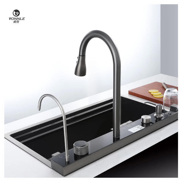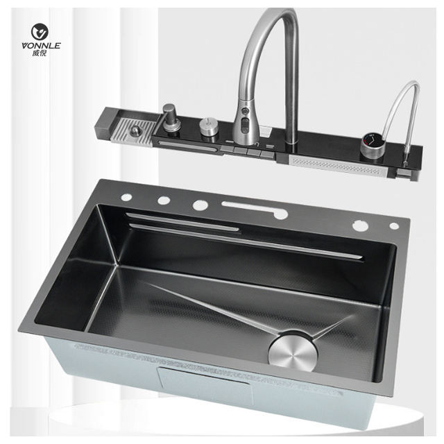Évier de cuisine en acier inoxydable à cuve unique avec robinet extractible, design moderne, effet cascade de pluie volante