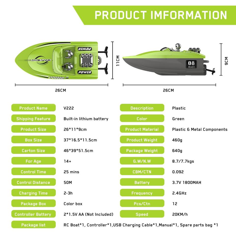 Bateau télécommandé Flytec V222 2,4 GHz haute vitesse 20 km/h avec batterie rechargeable, jouet étanche pour enfants