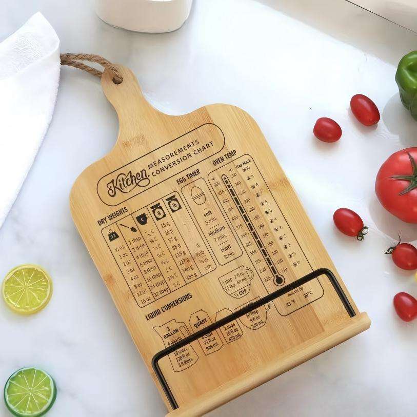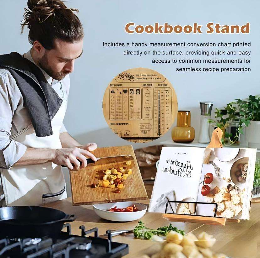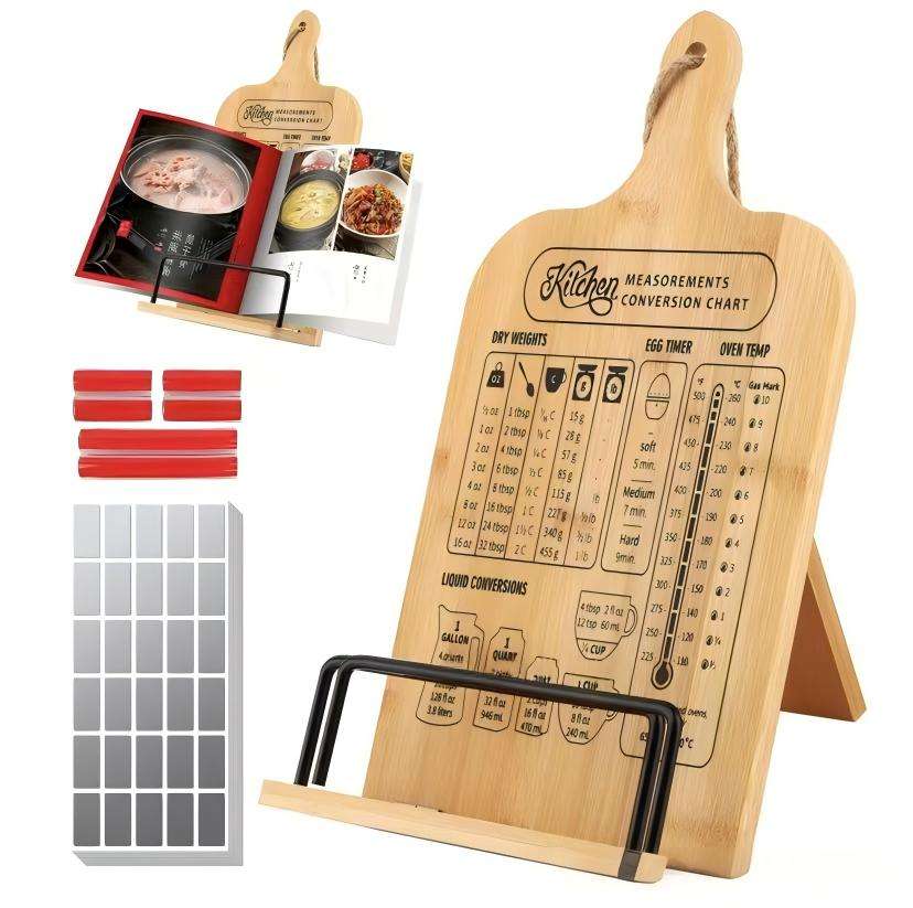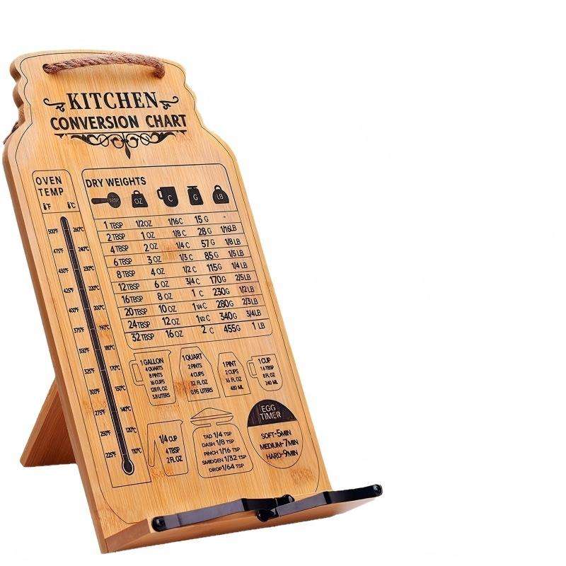 Support de livre de recettes pliable en bambou avec conversion des mesures, support de comptoir de cuisine et porte-recettes suspendu