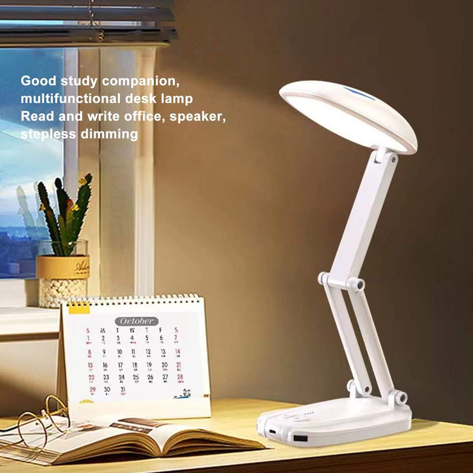 Lampe de bureau LED pliable, lampe portable avec double haut-parleur BT multifonctionnel pour la maison, la lecture, les études, le travail, les voyages