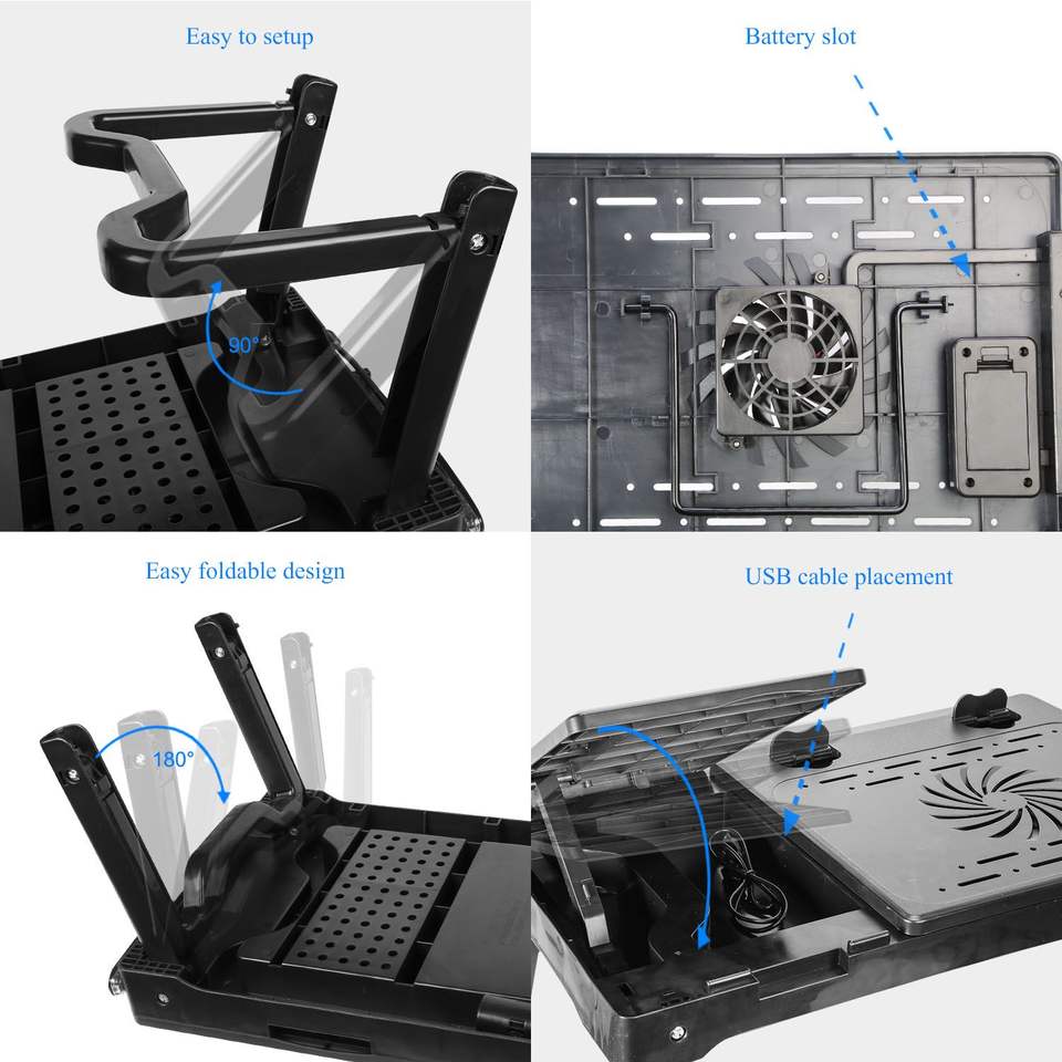 Table pliable pour ordinateur portable avec ventilateur de refroidissement, lumière LED, 4 ports USB, plateau de petit-déjeuner ou de collation – Bureau pour lit ou utilisation avec ordinateur portable