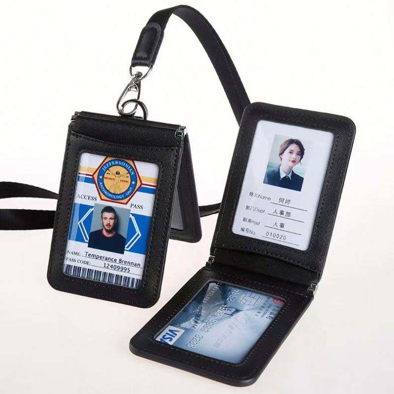 Porte-cartes de travail pliable en cuir avec cordon, porte-badge, porte-carte d'accès au bus, étui de protection pour cartes