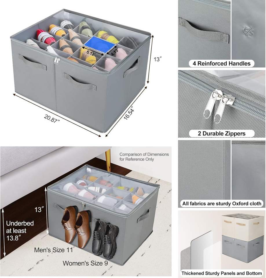 Boîte de rangement pliable pour chaussures avec séparateurs ajustables, poignée robuste, couvercle en PVC transparent de haute qualité, fermetures éclair fluides