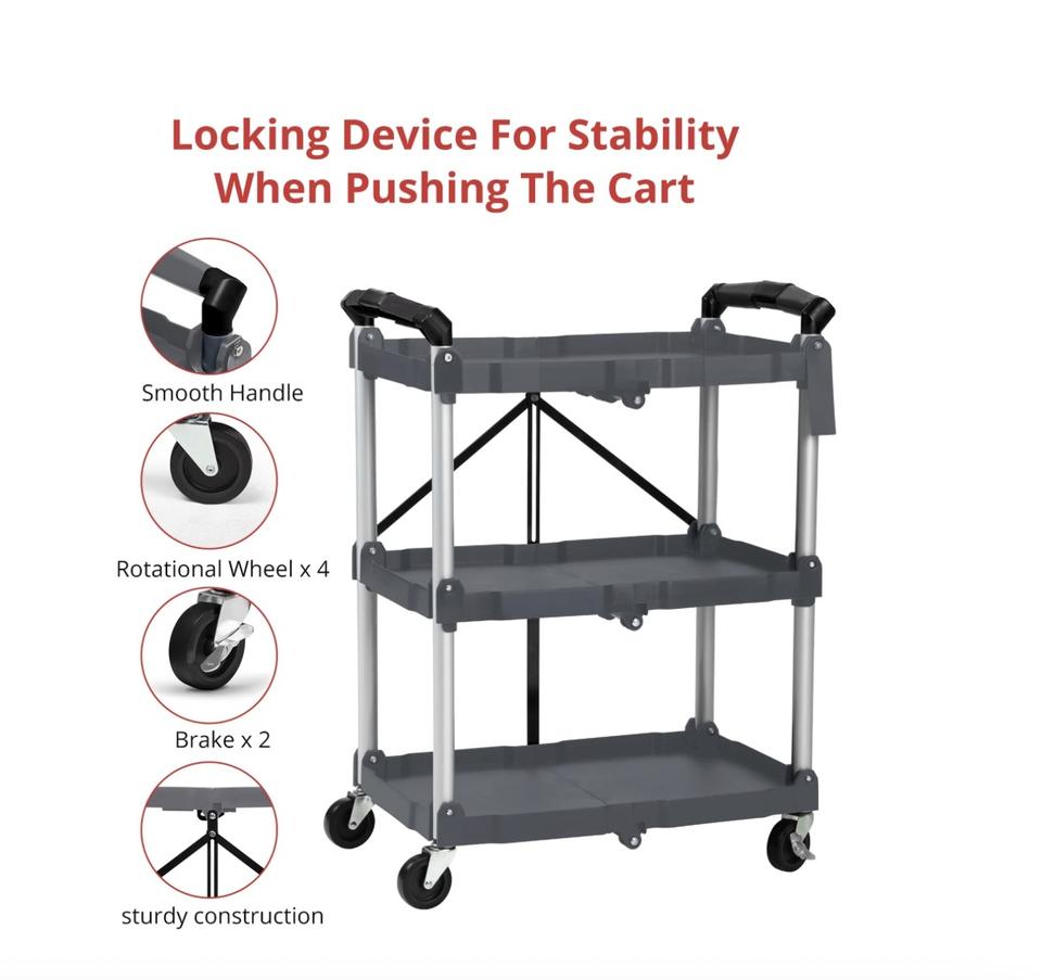 Chariot utilitaire pliable avec roues verrouillables, chariot de service roulant portable à 3 niveaux
