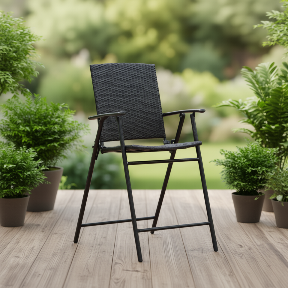 Chaise de bar pliante en rotin avec accoudoirs, structure métallique, utilisation intérieure/extérieure, design contemporain, apparence moderne, mobilier commercial