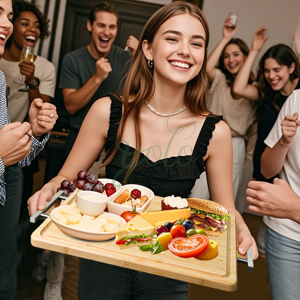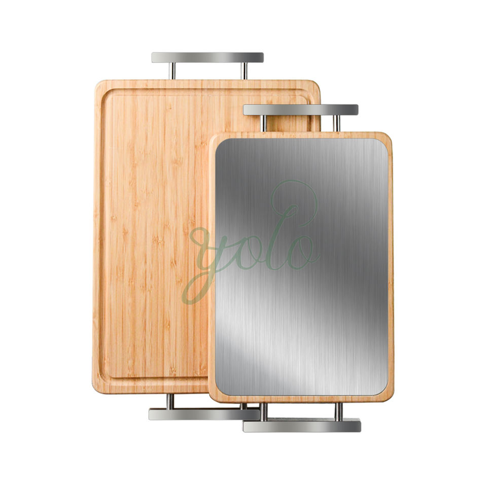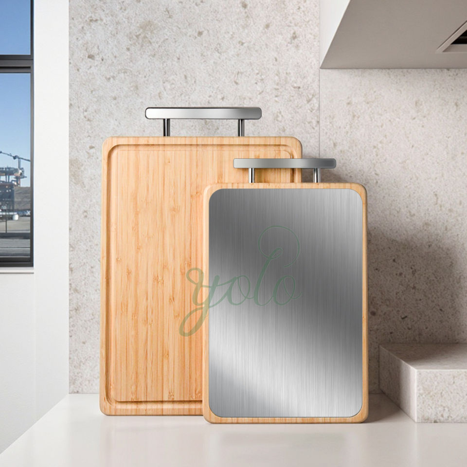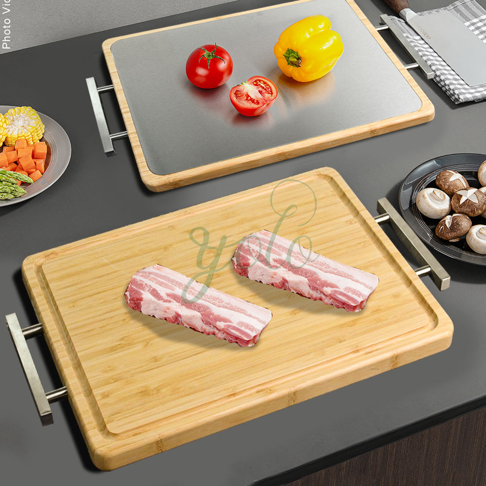 Planche à découper en bambou double face multi-usages de qualité alimentaire avec manche en acier inoxydable pour bloc à découper la viande et le poisson de cuisine