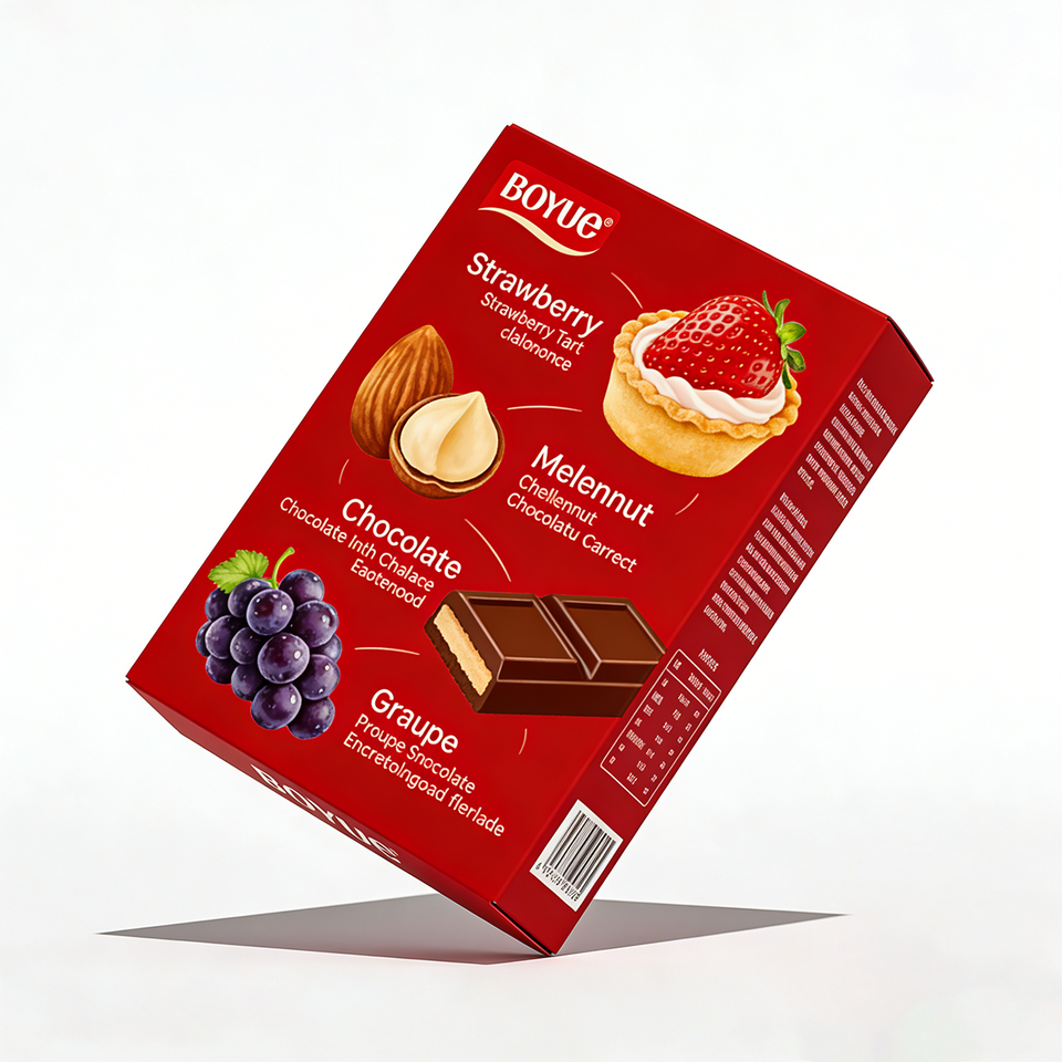 Boîte en papier coloré en matériaux recyclés de qualité alimentaire, résistante à l'huile, laminée UV, imprimée sur mesure pour l'emballage de biscuits faits maison et de pâtisseries.