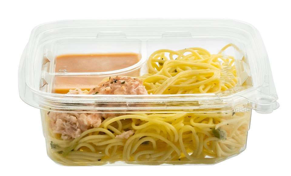 Plateau à charnière en PET recyclable et sûr pour les aliments avec languette de sécurité et boîtes en plastique avec logo en relief pour ensembles de repas et nouilles