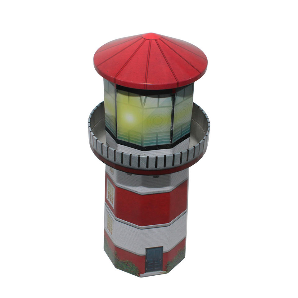 Boîtes de rangement réutilisables en fer blanc en forme de phare, conformes aux normes alimentaires, pour bonbons, jouets pour enfants et emballages cadeaux, avec option de logo personnalisé
