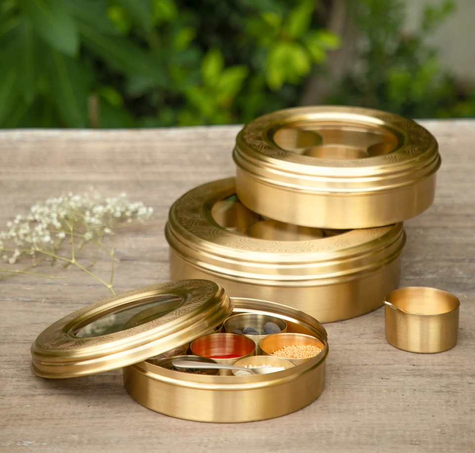 Support de stockage d'épices alimentaires ustensiles de cuisine personnalisé rond Design fantastique en laiton fabriqué à la main Masala boîte au meilleur prix