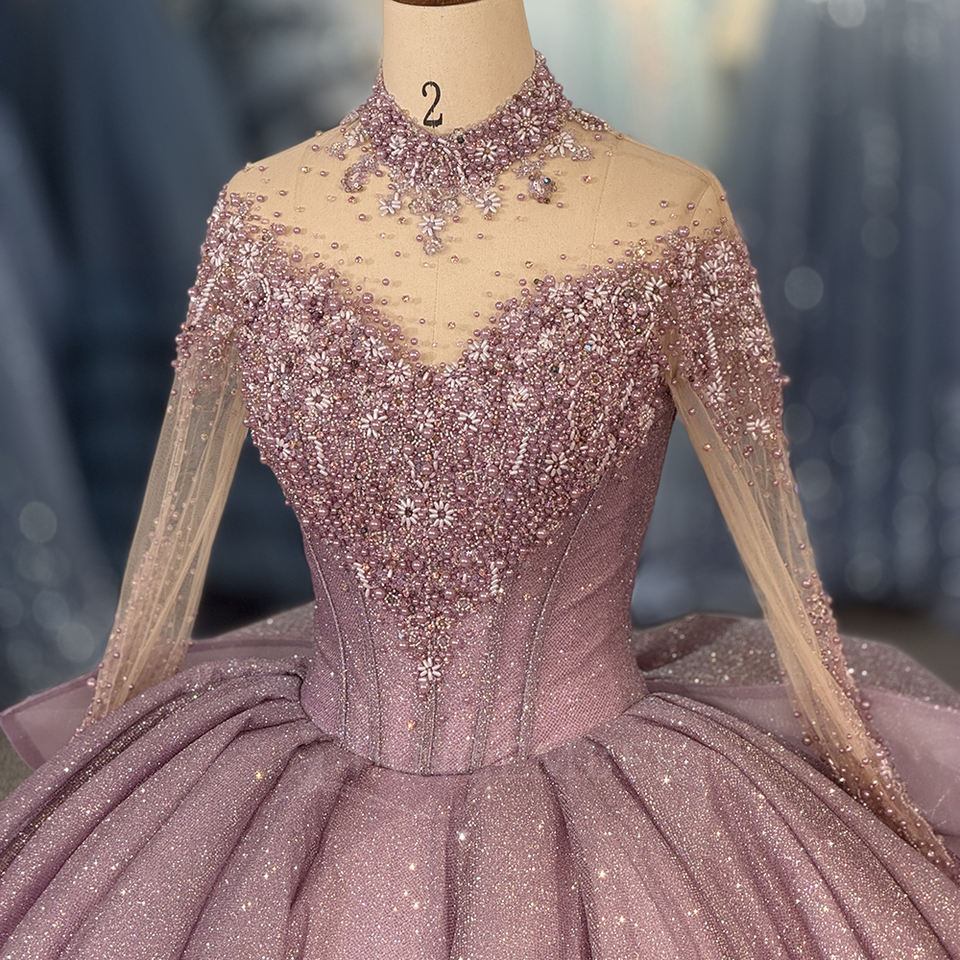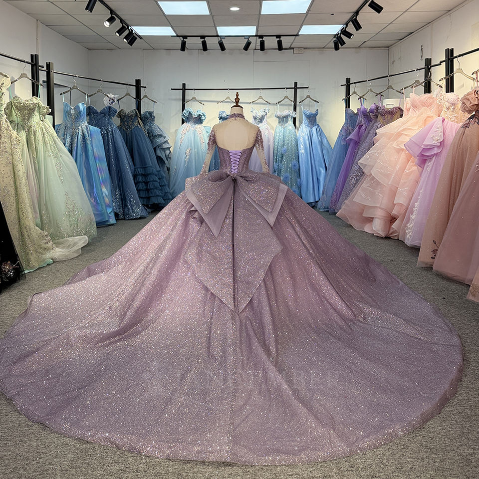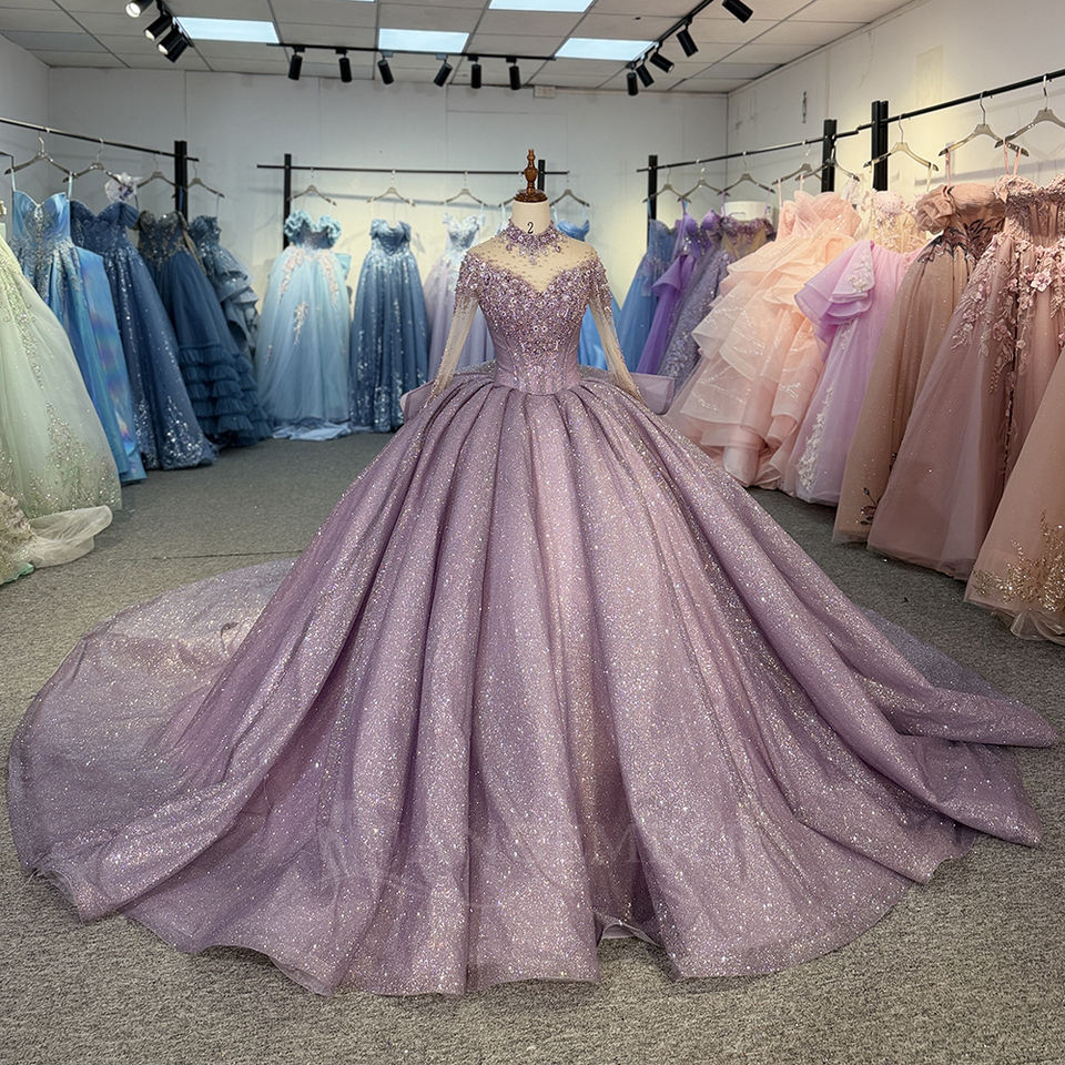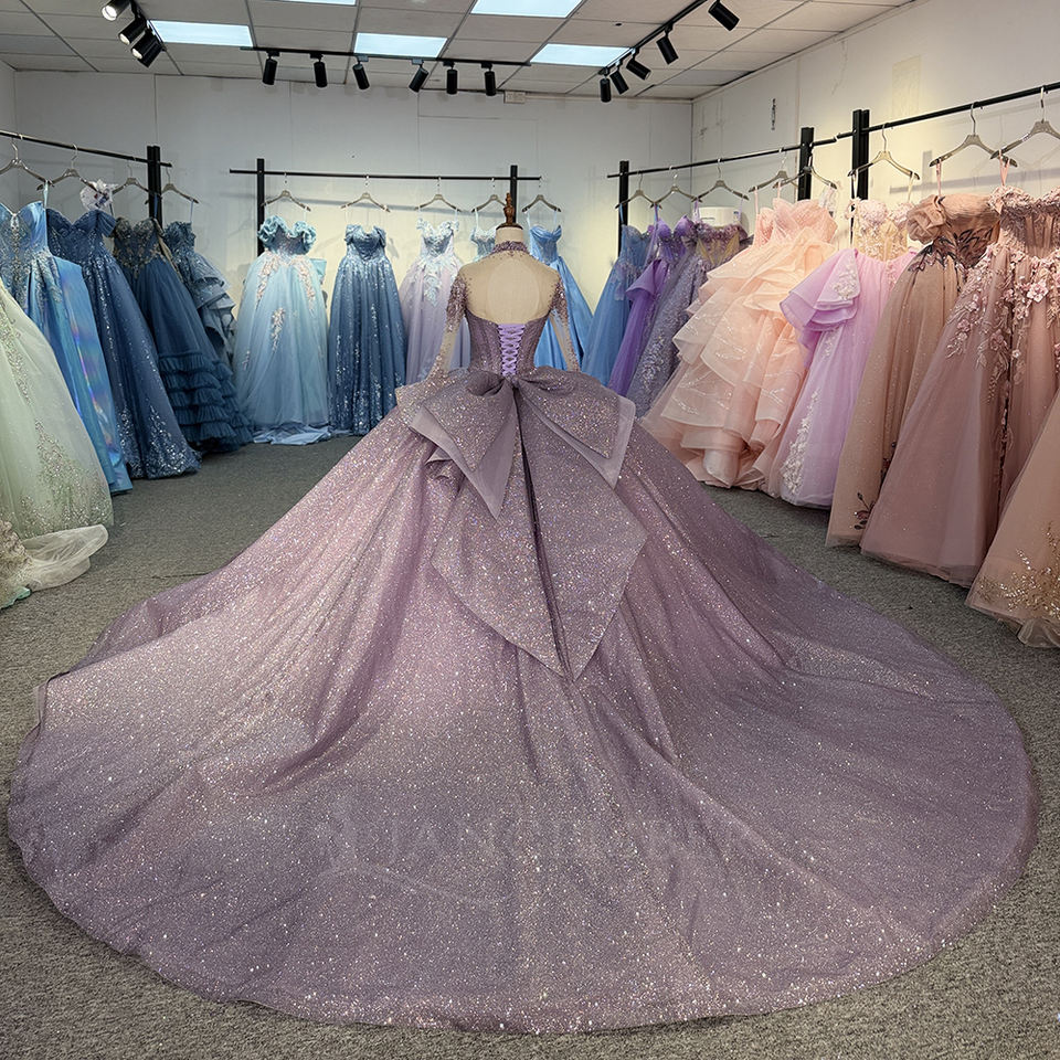Robe de bal de Quinceañera 1522 violet scintillant à col montant, avec appliques en dentelle et cristaux, antistatique, traîne chapelle, longueur ras du sol