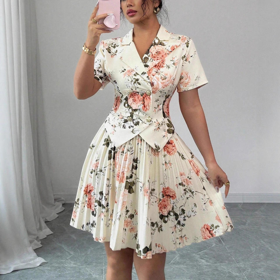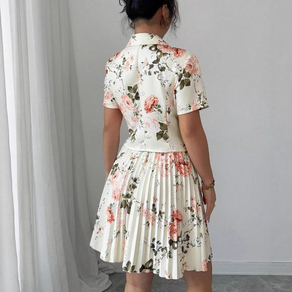 Nouvelle Collection Printemps-Automne 2026 : Ensemble Deux Pièces Chic et Polyvalent pour Femme – Imprimé Floral Élégant, Coupe Midi Décontractée avec Boutons